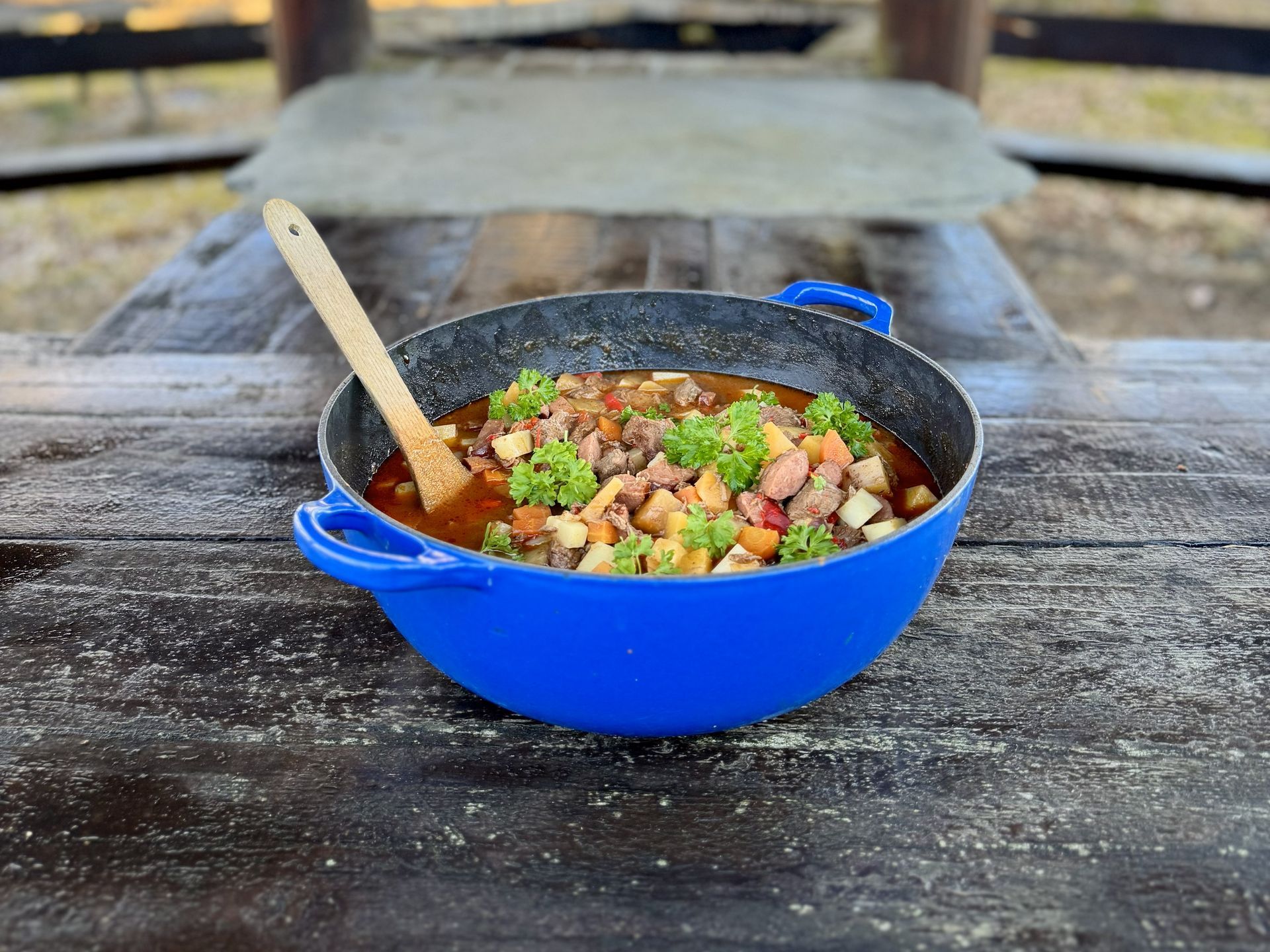 Få levert en herlig gulasj fylt med elgkjøtt fra skogen dere sover i. Gryta leveres ferdig laget til campen. Gi den en oppvarming på gassbluss før dere nyter den.